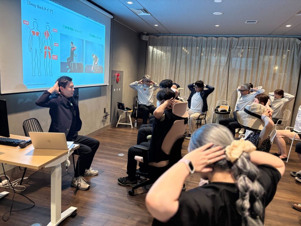 後半には、参加者が実際に身体を動かす「ストレッチ体験」セッションが行われました。理学療法士監修のもと、業務の合間にも実践可能な軽度な運動が紹介され、参加者の皆様からは「身体が軽くなった」「簡単で続けやすい」といった前向きなご感想が寄せられました。